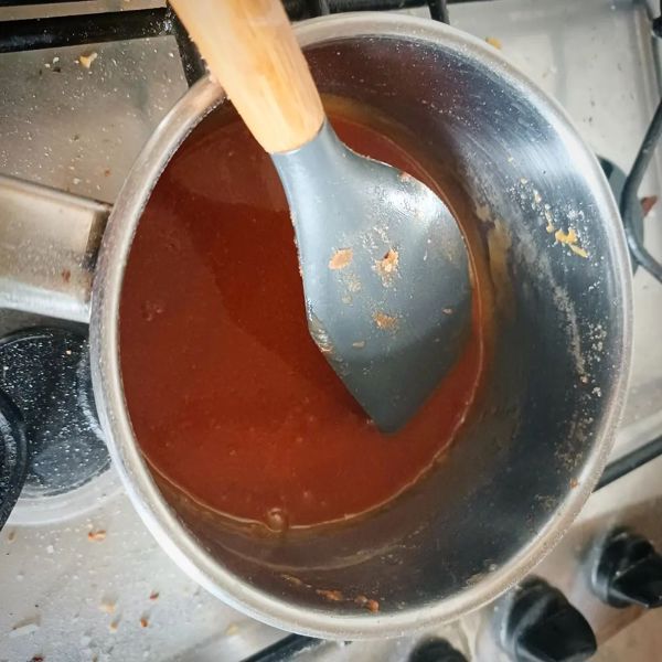 Allow the sugar to dissolve slowly, then simmer without stirring until it becomes a caramel colour, then immediately remove from the heat.