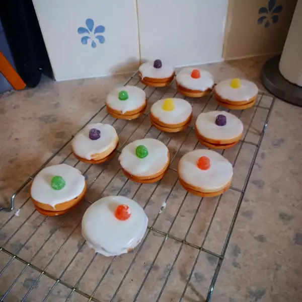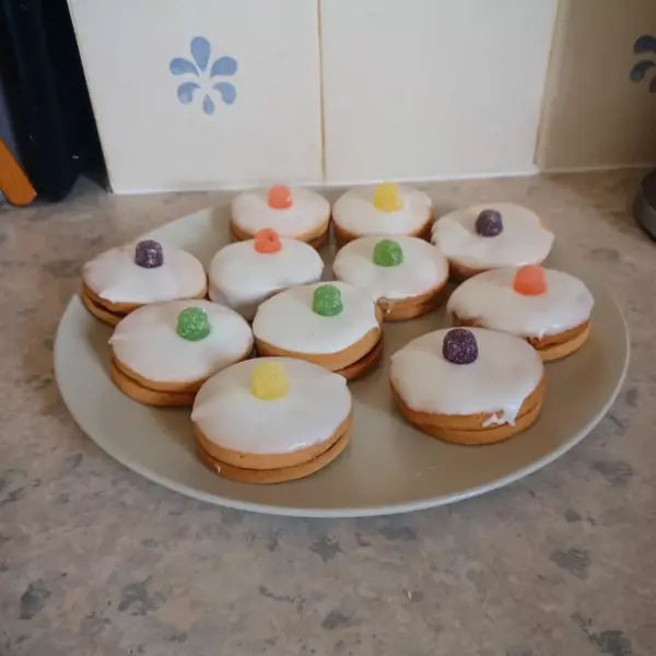 Once ready take your biscuits and place top down into the icing. Remove and smooth off if needed then place on the cooling rack and place the sweet of choice on the top.
