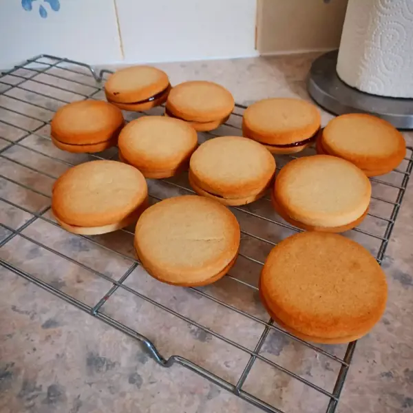Once cooled but not cold take the biscuits and add a teaspoon of the jam to one side then sandwich them together. Once all are done, place in the fridge to help cool for 10-15 minutes.