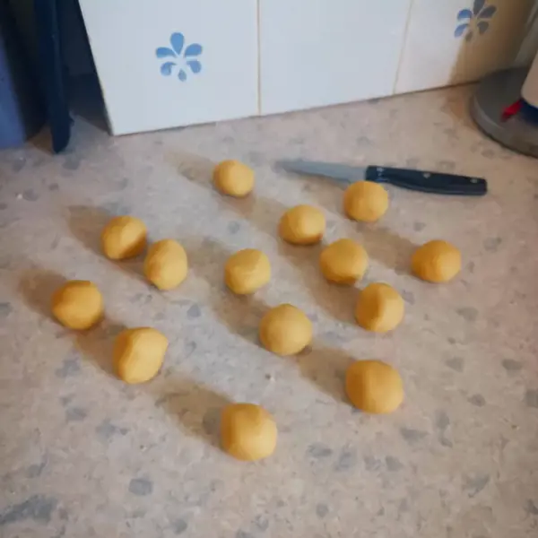 Place the ball in the palm of your hand and press down on it to start to flatten it. Once it tarts to flatten use your thumb to leave a dent in the middle. Do for all pieces then place on your baking tray.