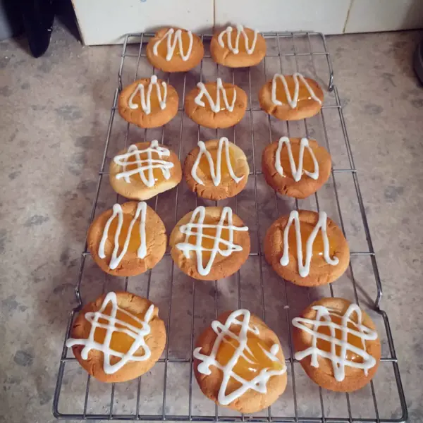 Finally you can drizzle the icing sugar over the top of the cookies. You can do this via a spoon or a piping bag. I used a freezer bag that I cut the tip off of one of the corners and it worked like a mini piping bag.