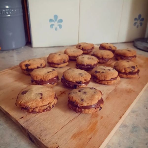 Fill a piping bag with nutella and pipe onto one cookie then place another on top to sandwich. You will want to place these into the fridge to cool and harden the nutella other wise they will be too squishy.