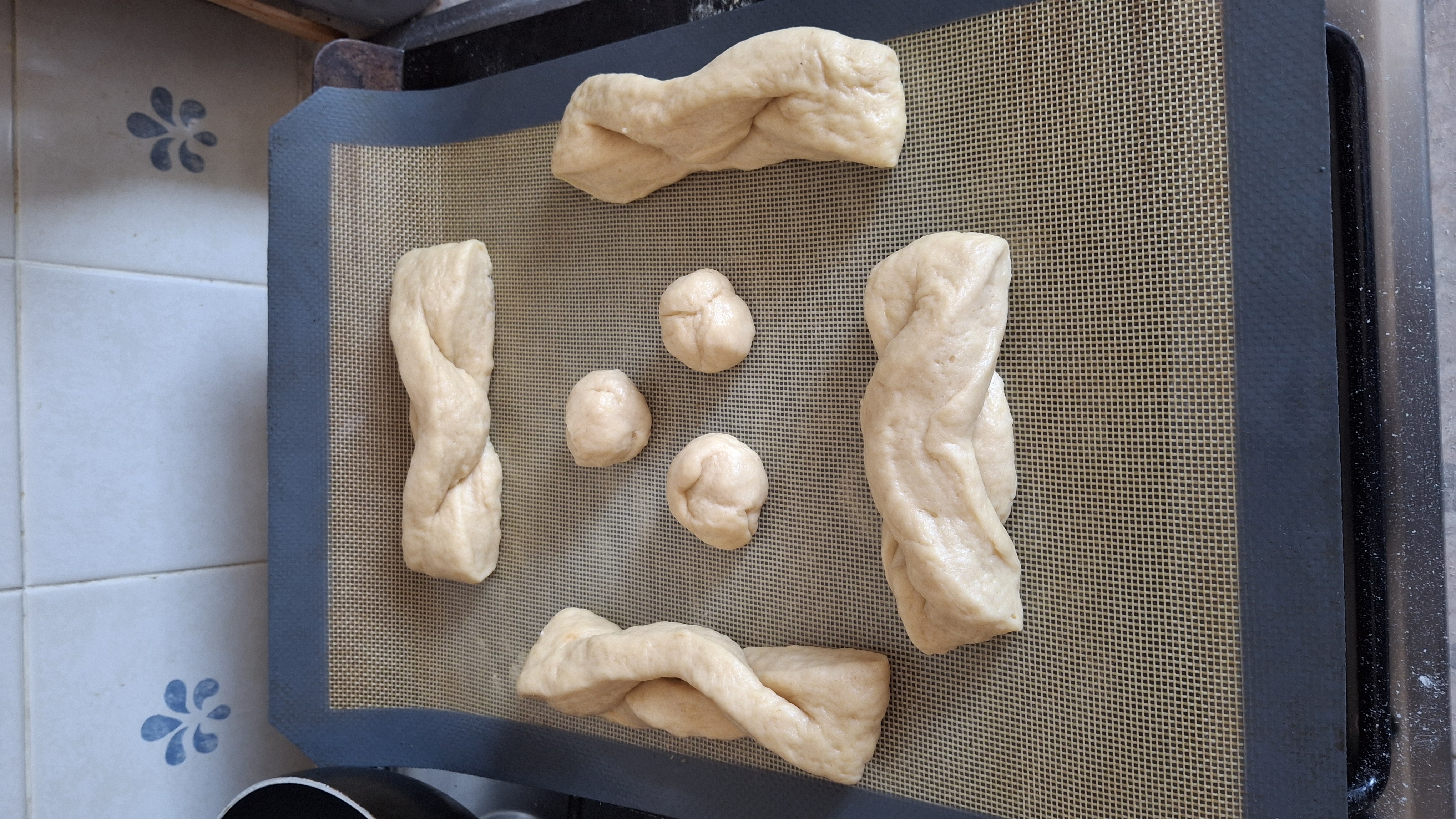 Get a tray where the Yum Yums will sit for their final proof (I usually place a baking mat on it. Now before moving over the Yum Yum's cut a line down the middle of each but leave a gap at the top and bottom so you don’t cut it in half (usually about a centimetre or just over each end). Carefully lift the ym yum and move it over onto the tray and once placed, take the two side parts and place one on top and one under to create a twist. Do this with all, then take a piece of cling film and lightly brush some olive oil on it and place over the tray.