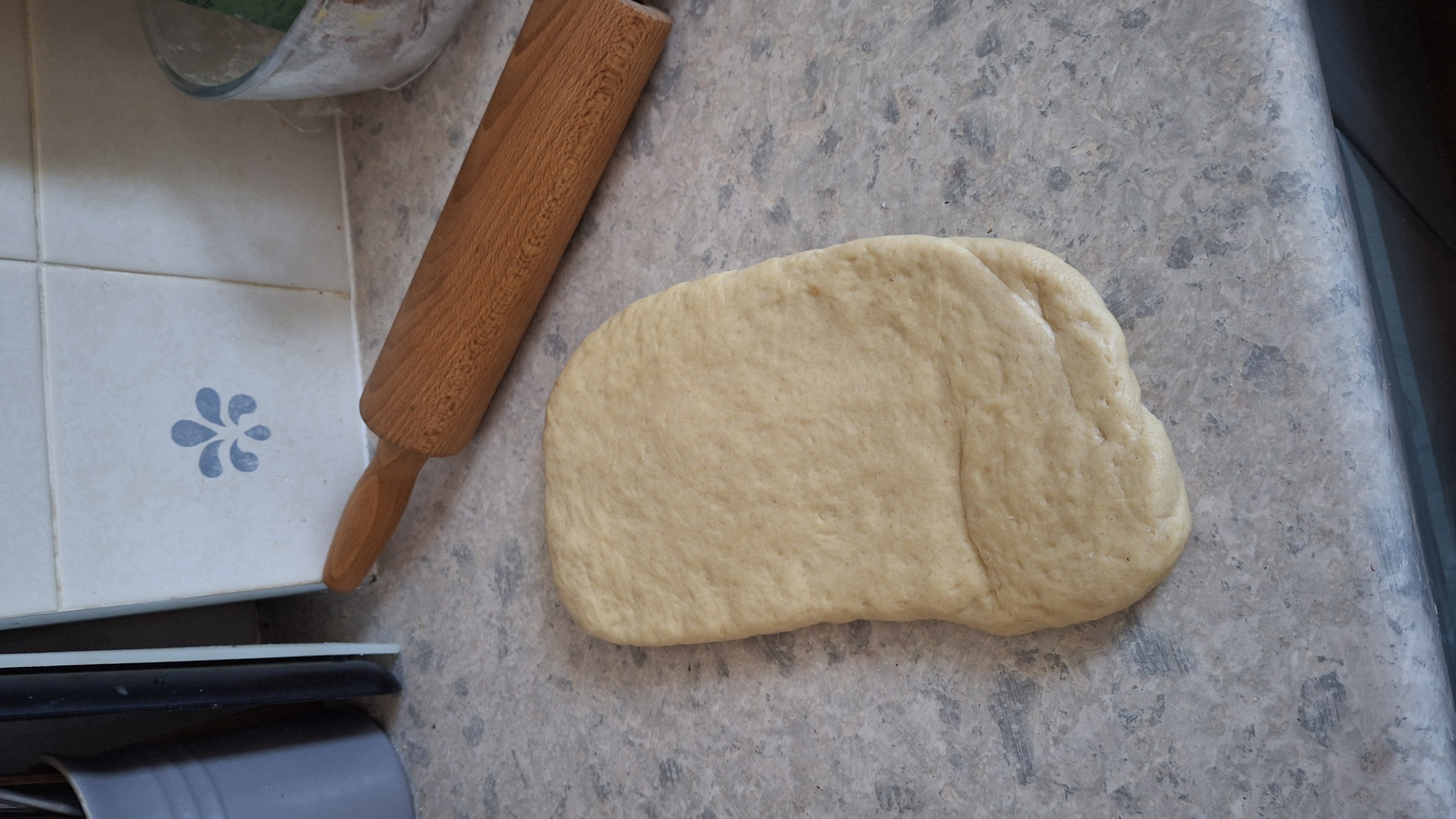 Flour surface and place contents out onto surface. Now roll the pastry into a long rectangle. At this point take a knife and divide up your dough. You should be able to get 4-5 strips from this depending on how big you cut them and possible some left over to make a couple of dough balls.