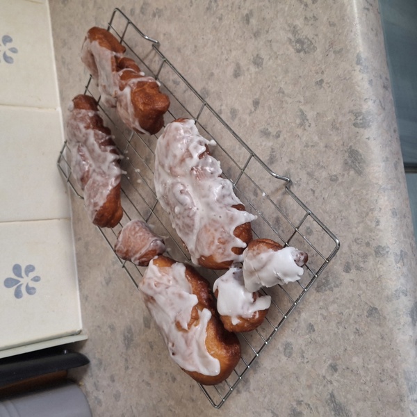 Yum Yum's are a sort of cross between a doughnut and a croissant and are a savoury snack covered with icing. Their distinctive shape is made by twisting and intertwining the dough before the last proofing and are typically found in Britain.